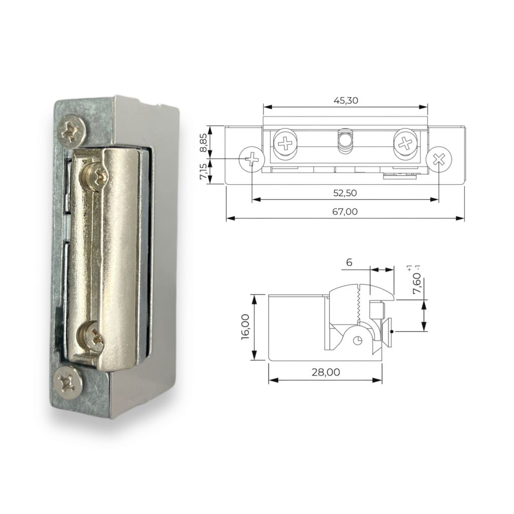 Rozměry: 16,5 x 67 x 28 mm (š x v x h)Stačí krátký elektrický impulz, kdy je otevřeno, do doby, než někdo projde dveřmi.