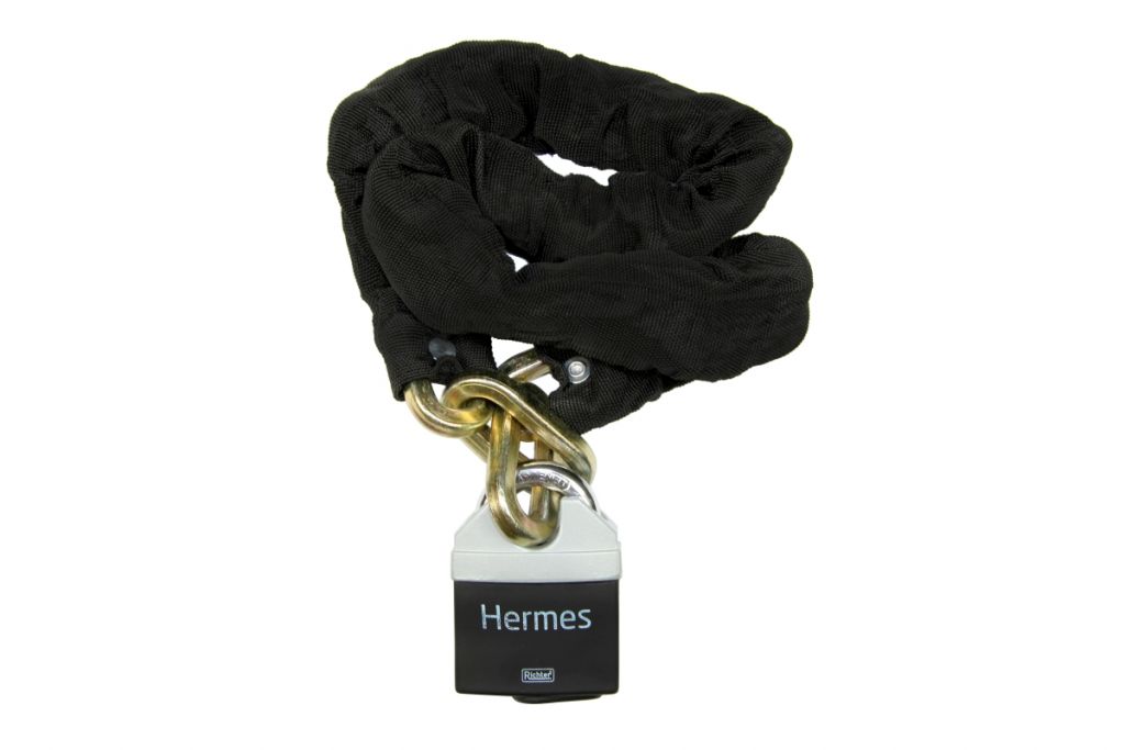 SOUPRAVA ŘETĚZU A VISACÍHO ZÁMKU. Visací zámek certifikován v bezpečnostní třídě RC2 dle ČSN EN 1627:2012. Certifikát NBÚ typ 1 SS4=1. Bezpečnostní řetěz HARDENED s ochranným krytem z textílie. Oko řetězu O 10 mm, délka 1000 mm Hmotnost soupravy netto: 2,38 kg
