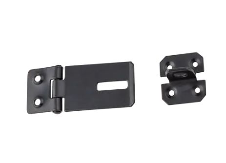 Černý uzávěr pro připevnění visacího zámku na dveře nebo bránu. Účinně chrání před otevřením.