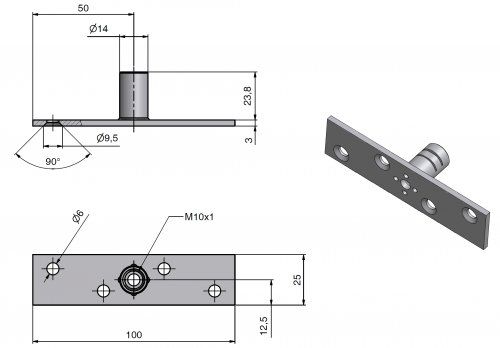 Použití: Upevňovací element pro zakování závěsu do obložky kovové zárubně (OKZ) pro závěs se svorníkem M10x1. Držák je vyroben ze železa.