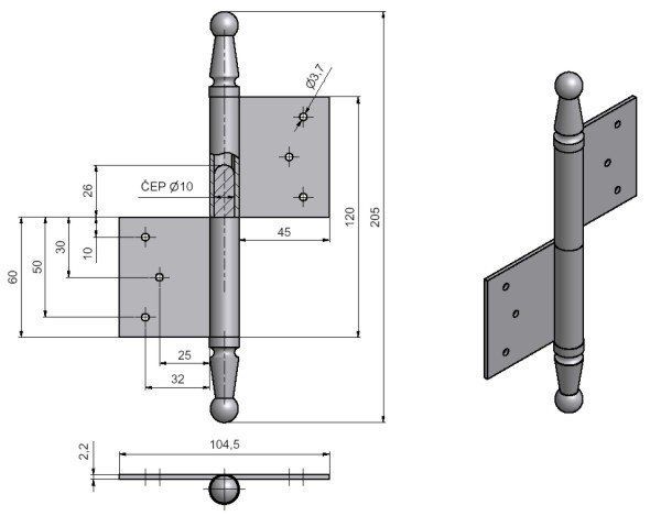 Závěs je určený k otočnému spojení dveří s dřevěnou zárubní. Spodní i vrchní díl je k zadlabání (nutno zajistit hřebíky bez hlavičky) Čep závěsu je opatřen ozdobným ukončením UR01. Velmi vhodný při rekonstrukcích starých dveří.