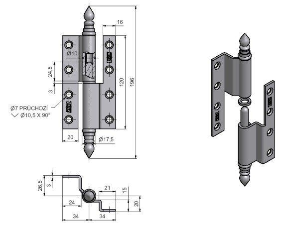 K otočnému spojení dveří s polodrážkou a dřevěné zárubně. Čep je opatřen ozdobným ukončením. Závěs je vhodný při rekonstrukcích starých dveří. Doporučujeme ho přišroubovat až po provedené povrchové úpravě dveří a zárubně.