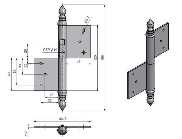 K otočnému spojení dveří s dřevěnou zárubní. Spodní i vrchní díl je určen k zadlabání. (nutno zajistit hřebíky bez hlavičky) Čep závěsu je opatřen ozdobným ukončením UR14. Velmi vhodný při rekonstrukcích starých dveří.