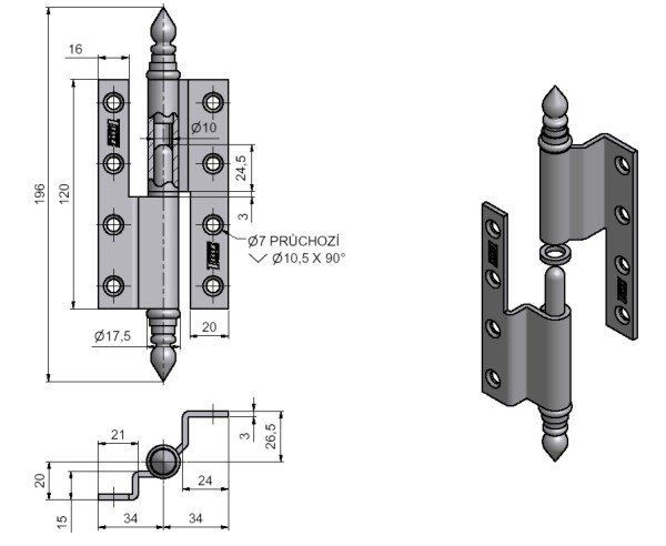 K otočnému spojení dveří s polodrážkou a dřevěné zárubně. Čep je opatřen ozdobným ukončením. Závěs je vhodný při rekonstrukcích starých dveří. Doporučujeme ho přišroubovat až po provedené povrchové úpravě dveří a zárubně.