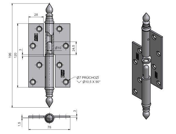 Závěs (pant) slouží k otočnému spojení dveří bez polodrážky s dřevěnou zárubní. Čep je opatřen ozdobným ukončením. Závěs je velmi vhodný při rekonstrukcích starých dveří. Doporučujeme ho přišroubovat až po provedené povrchové úpravě dveří a zárubně.