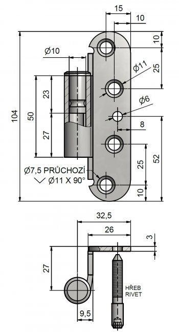 Popis produktu Závěs dveřní 50/3 s hřebem VD P Zn bílý