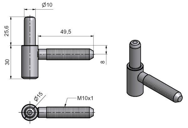 samostatně dodávaný spodní díl závěsu, je určen především k zašroubování do lomeného držáku M10x1 pro dřevěné obložkové zárubně.