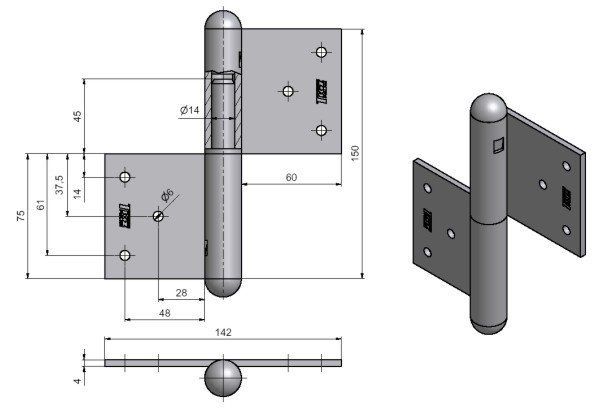 Závěs se používá k otočnému spojení velkorozměrových dveří nebo vrat se zárubní. (Vrchní i spodní díl nutno zajistit hřebíky bez hlavičky.)