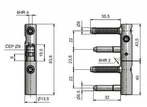 Seřiditelný závěs ve třech směrech pro vrchní větrací křídlo (ventilačku) špaletového okna. Svým provedením zabezpečí křídlo proti bočnímu (vodorovnému) pohybu (proti vypadnutí)!