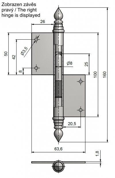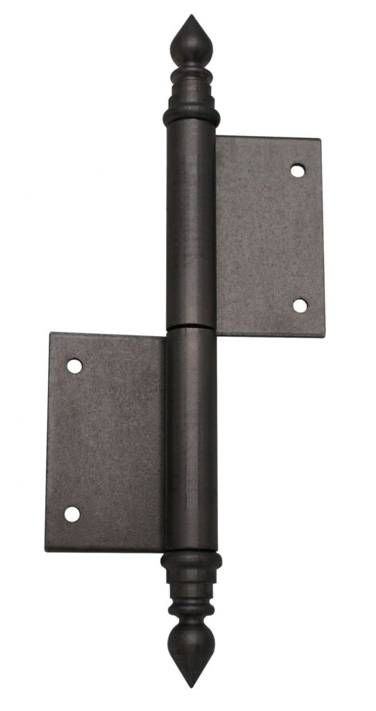 Závěs s ozdobným zakončením čepu. Používá se jako nosný závěs pro otočné spojení okenního křídla s rámem.