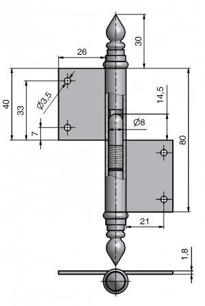 Závěs s ozdobným zakončením čepu. Používá se jako nosný závěs pro otočné spojení okenního křídla s rámem