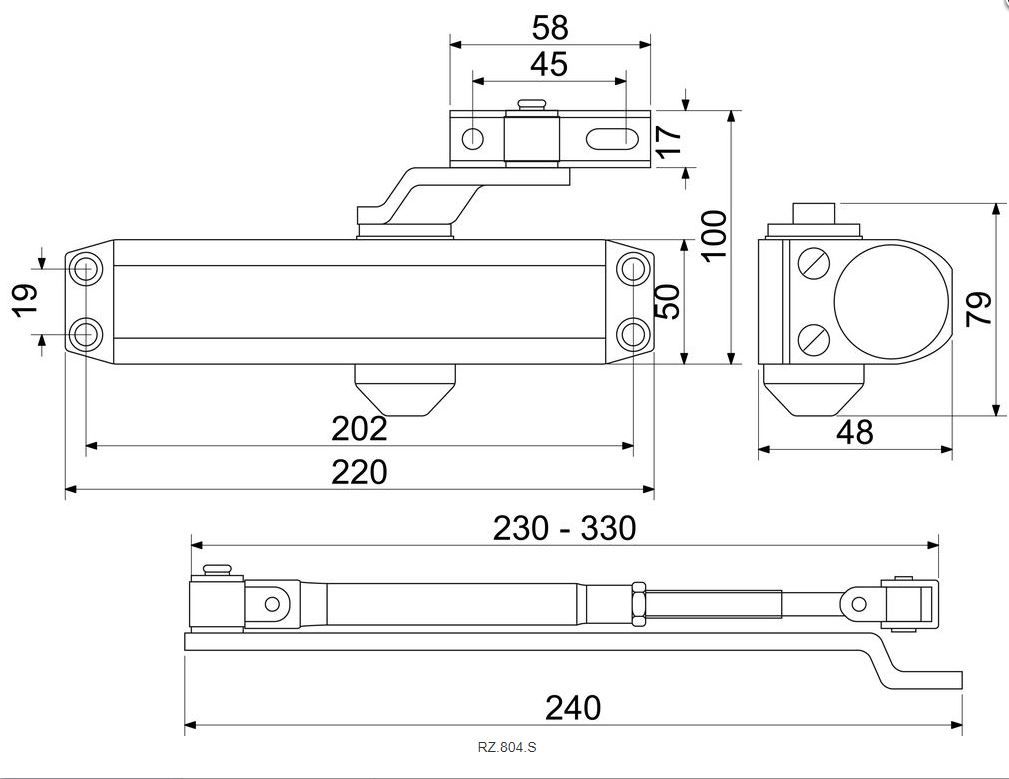 Vhodný pro požární dveře dle EN 1634.Nastavitelná rychlost zavírání a doklapu.Váha dveří max. 80 kg.Šířka dveří max. 1100 mm.Úhel otevření dveří pro zavírací sílu 2-3 max. 180°, pro zavírací sílu 4 max. 105°.Montáž na dveře nebo na zárubeň.Balení vč. standardního ramínka a montážního materiálu.