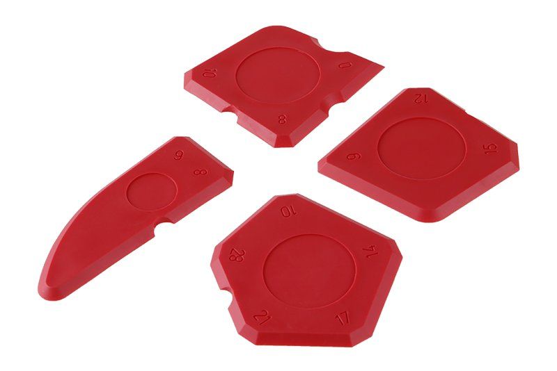 sada stěrek na práci se silikony a tmely stěrky mají různé tvary přizpůsobené pro práci při tmelení, utěsňování - spár, dilatací, materiálových přechodů apod. jednoduchým tahem při zvolení správného tvaru stěrky začistíte nanesený silikon nebo tmel (je nutné dodržet dobu zpracovatelnosti daného silikonu nebo tmelu!)