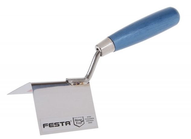 Rohová vyhlazovací nerezová lžíce FESTA 80 x 60 x 60 mm s dřevěnou ručkou. Lžíce rohová (koutová) je vyrobená z kvalitní nerez oceli o tloušťce 1,0mm, držadlo je dřevěné s lakovanou povrchovou úpravou. Vymazávačka se používá k úpravě a začištění jak vnějších, tak vnitřních rohů.