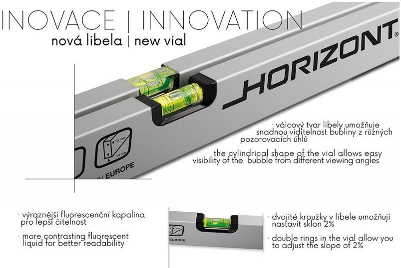 inovovaná horizontální válcová libela - snadná viditelnost ze všech úhlů pohledu